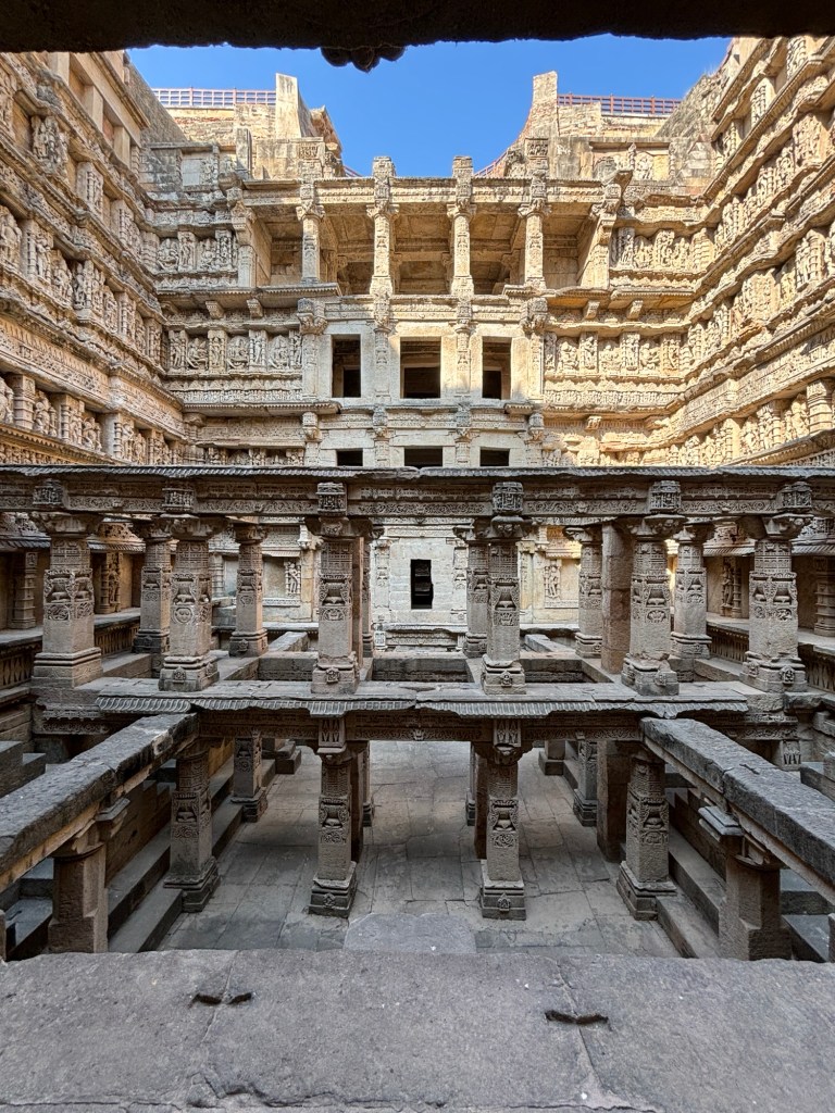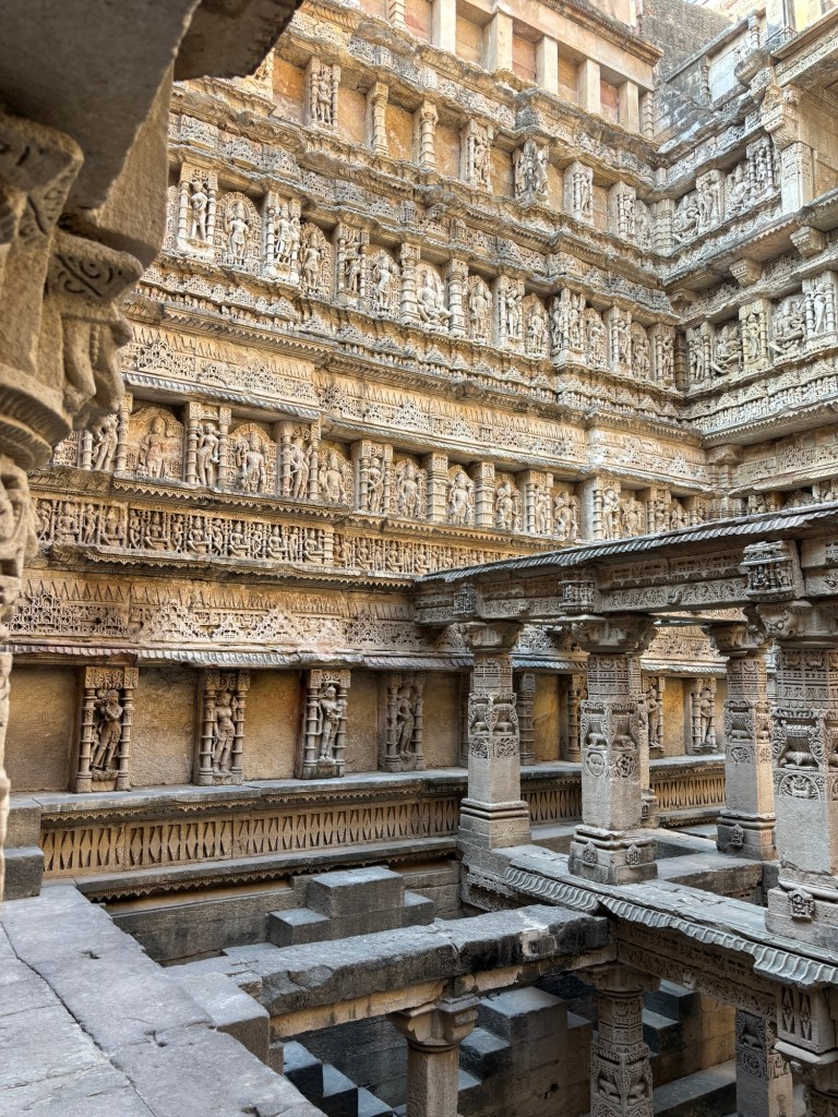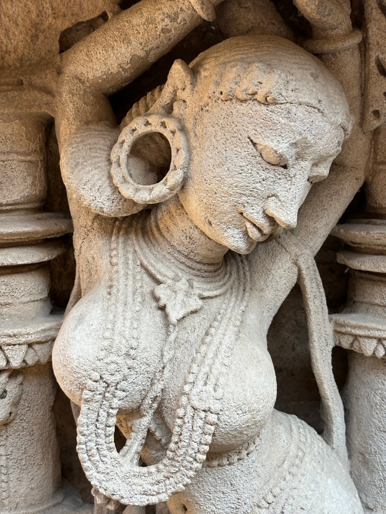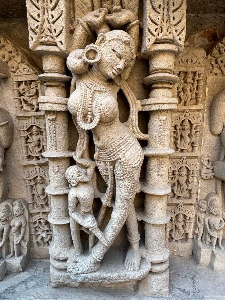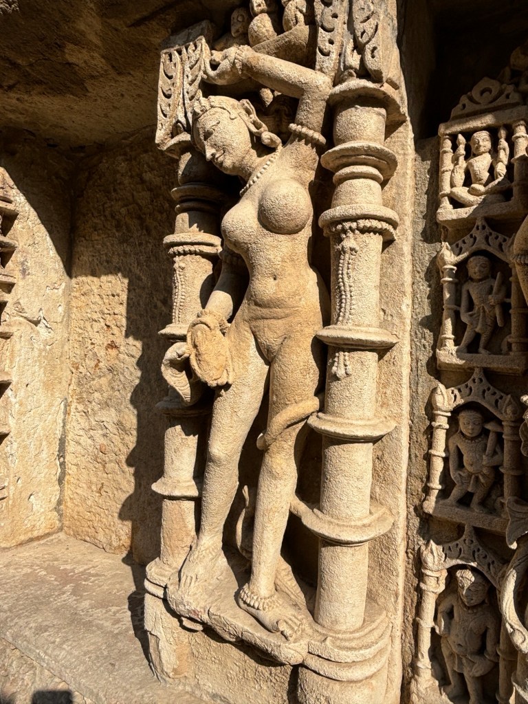 With this background, I share my thoughts on the sculptures I viewed yesterday in the Gujarati city of Patan. Known locally as Rani Ki Van, the ancient step-well was buried in mud by a flood from the River Saraswati until 1960. This twist of fate protected it through the centuries. Of the hundreds of sculptures the site contains, most remain perfectly intact despite being carved almost 1000 years ago (construction reportedly began 1026 and completed in 1063 CE).