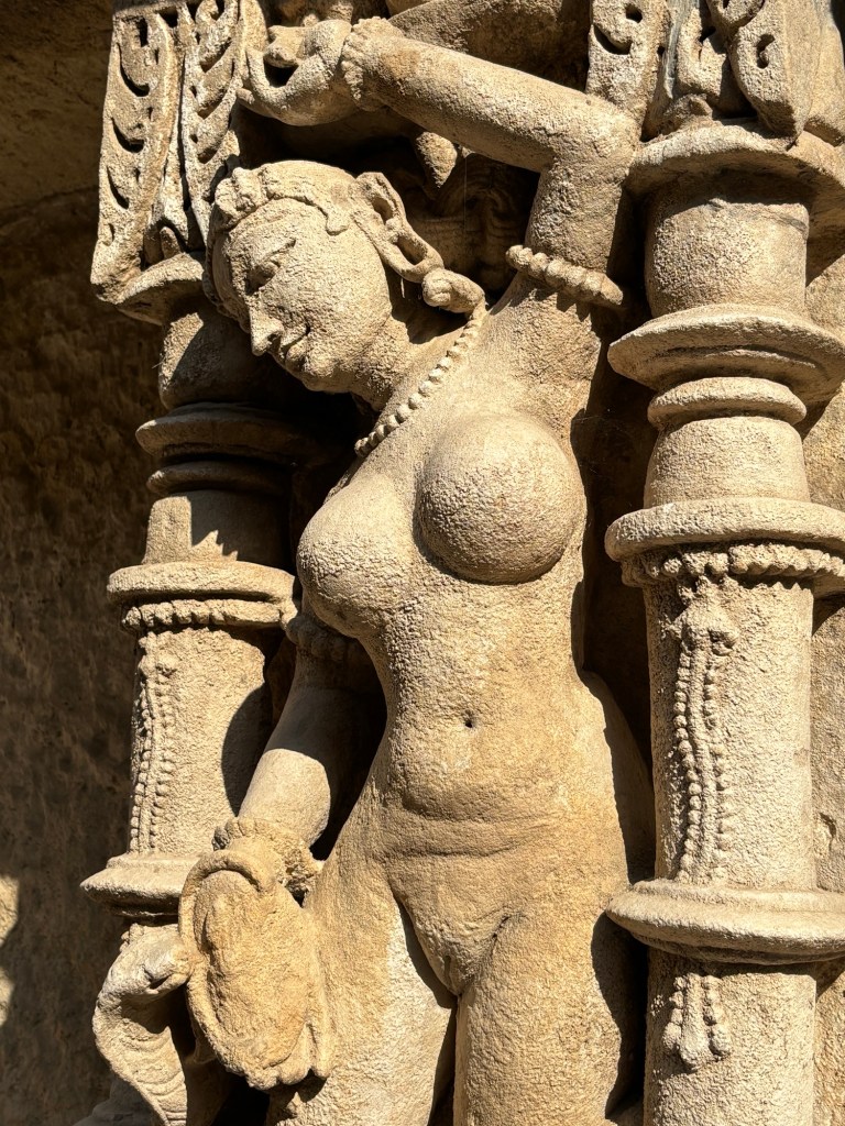 So how to consider these erotic, sensual forms? As symbols, they are clearly aspirational. Their impossibly large breasts are not the simple fantasy of stone carvers, but point us toward the archetype of the Sacred or Devine Feminine. This symbolic language shares its DNA with a common theme in poetry. It speaks of a place in the future, a “land of milk and honey.” Or to place it in the more contemporary context of Pink Floyd, a place of “blue skies, [and] green lights.” The Rani Ki Van sculptures offer us images of the nurturing breasts that could suckle an entire kingdom; never to know the want of the starving child, cyclical famine, disfiguring disease, or even death itself.