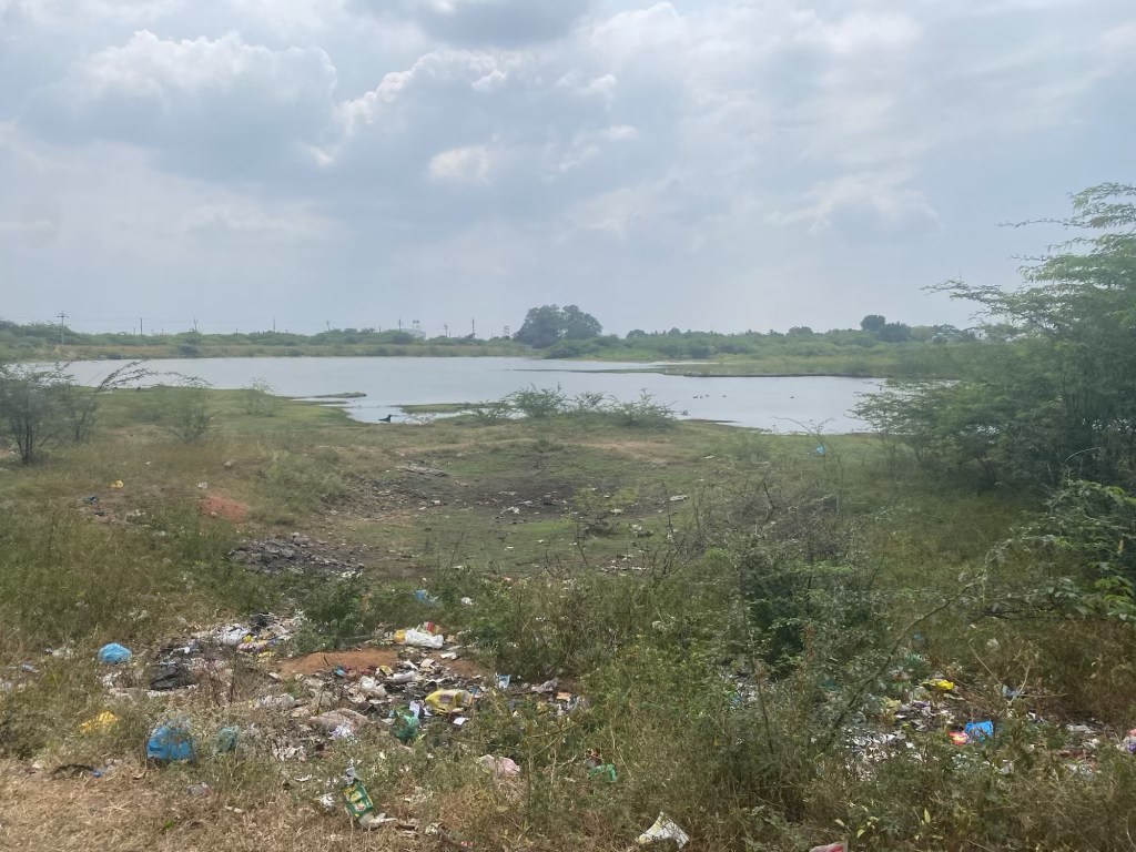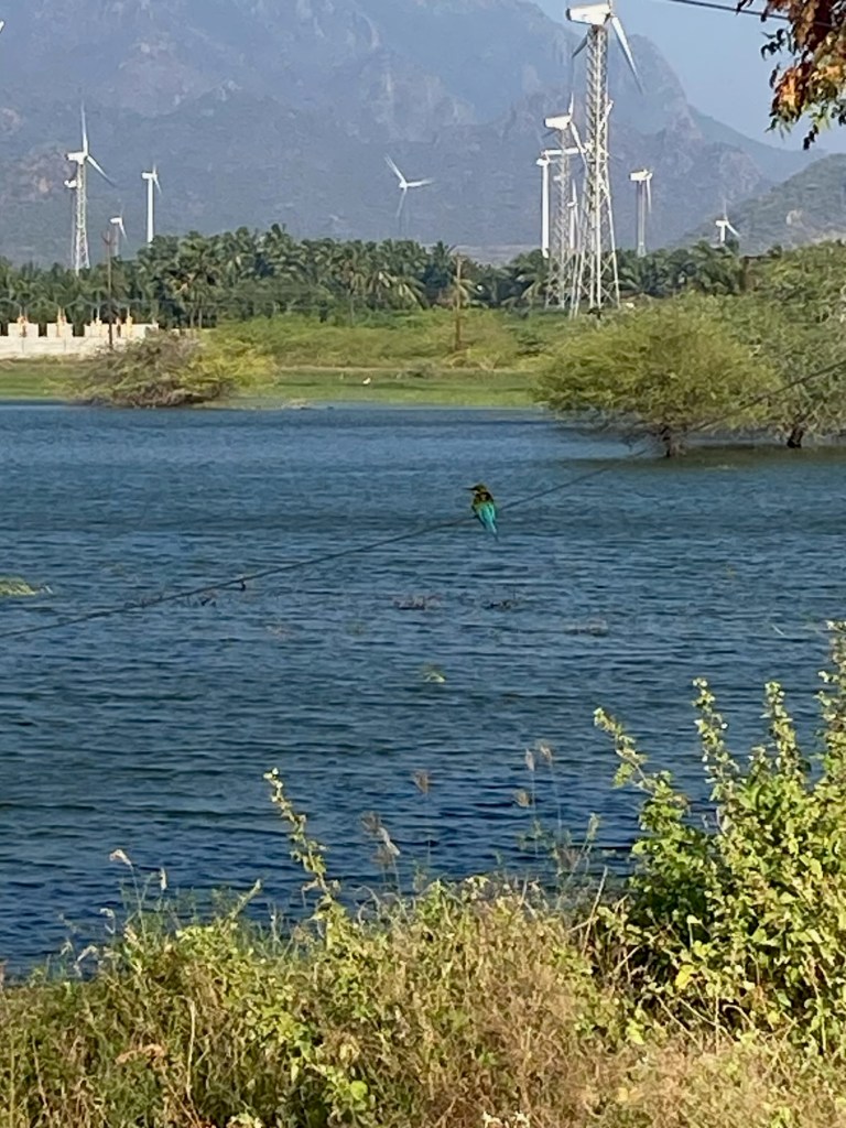 It is, with thorny Acacia-dotted scrublands and iron-rich red soil. So it surprised us to bike past lots of backwaters (and birds). These weren’t used for navigation, the way they were in Kerala before roads were built—we’re not seeing canals—but big and small waters abound between Kamyakumari and Tirunelveli.