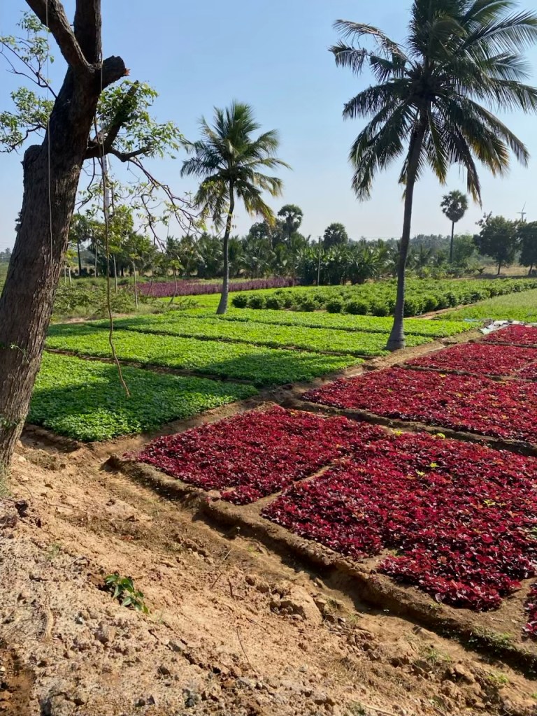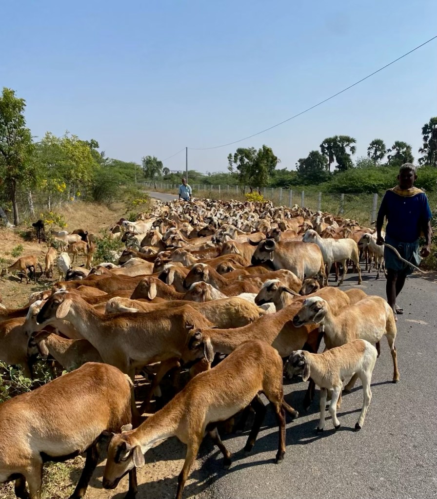 What we thought were barren soils are supporting a lot of beautiful small farms and orchards (coconut, banana, no citrus). We didn’t see any real farms along the coast in Kerala. Nor did we see any animals in lush Kerala, except an occasional non-holy cow (menus are packed with meat, chicken, and fish dishes) and dogs. Yet shrubby Tamil Nadu has goats and cows and chickens and dogs (and 100% veg restaurants!).