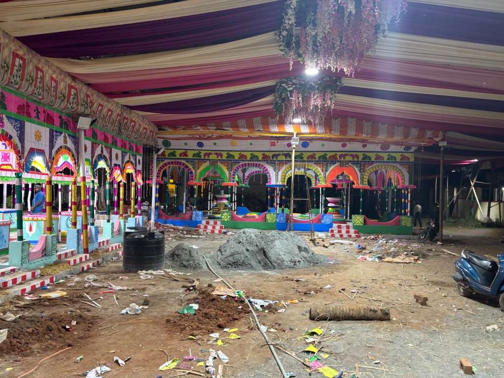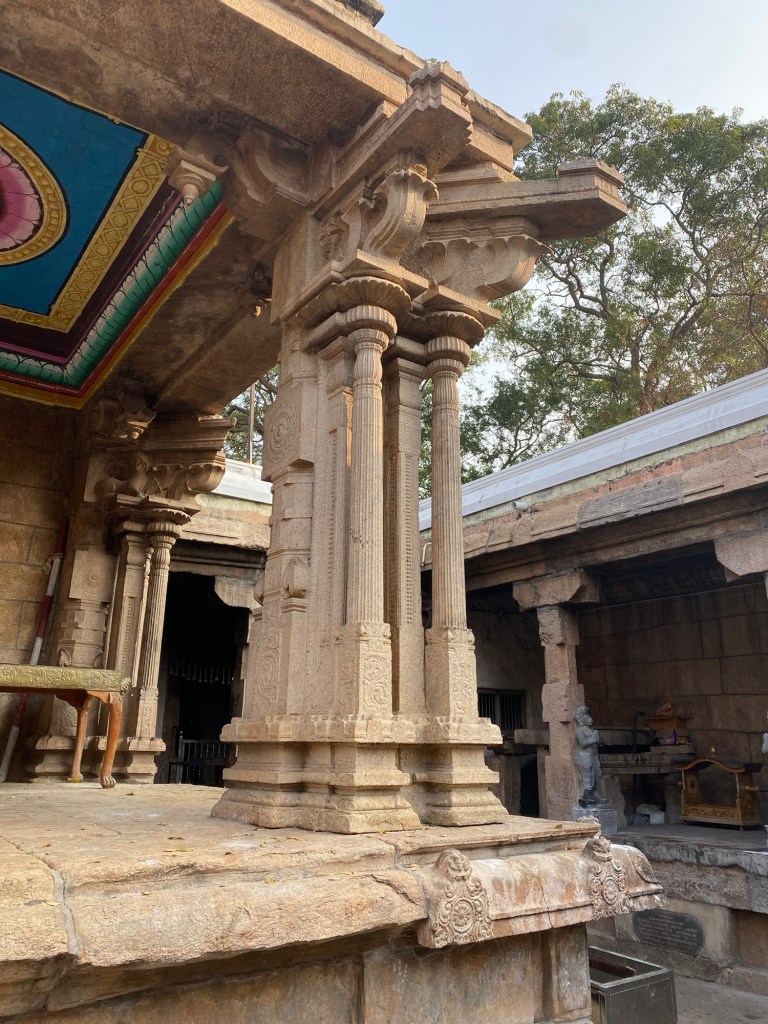 A little rest break and this auto rickshaw pulls up, music turned up! We got special permission to take a photo of these columns carved from a single stone inside the temple walls.Lime juice, soda water, and salt. A perfect little afternoon break. Sometimes our communication just misses the mark. There was no sugar possible for the soda, but then it was offered for my orange juice. The street side stall that made said lime and soda for Richard and a fabulous fresh orange juice for me.Sexy temple walls, different temple.Three religions will celebrate next weekend at the temple down the street of where we are staying. The party tent has been erected! More on the banyan trees in a future post. You’ll never guess what’s in the bags.