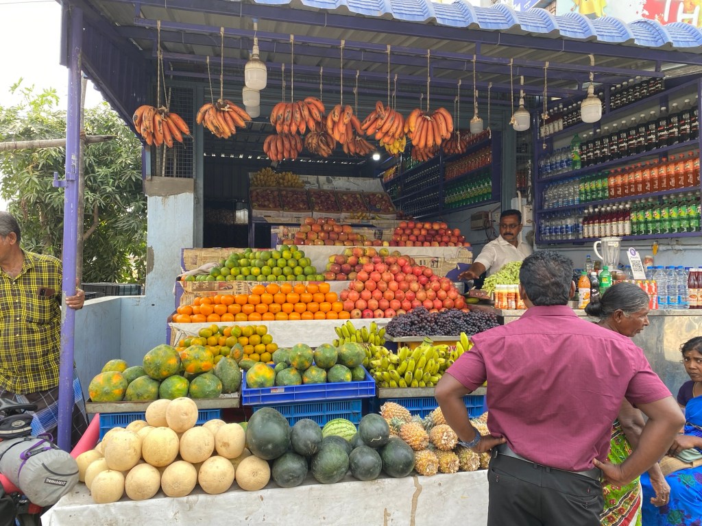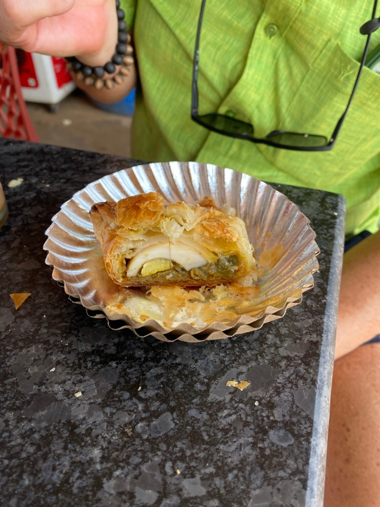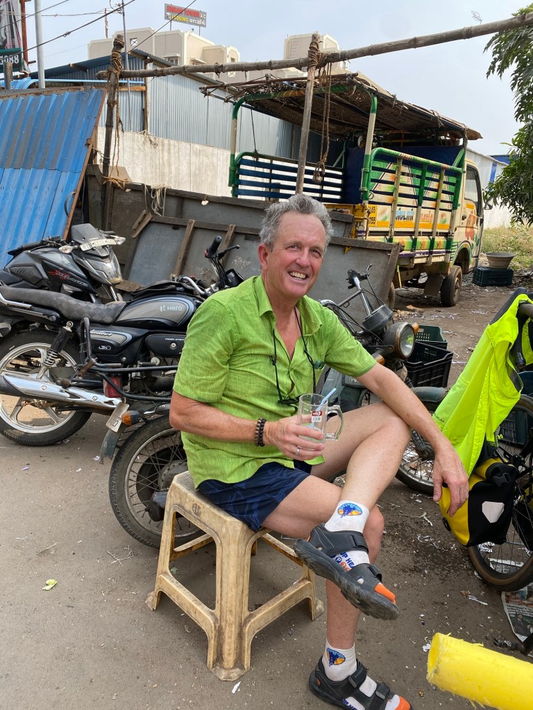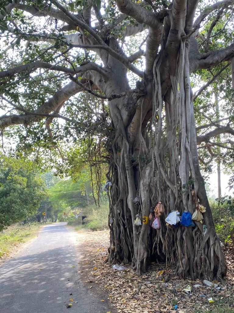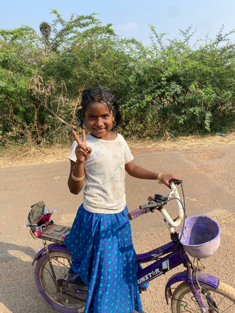 We left Madurai early this morning to enjoy the cool morning and miss all the city traffic. The sun rose so quickly!A favorite roadside breakfast. Flaky croissant dough filled with a hard boiled egg, a chili pepper, and something(s) else. Sometimes we eat three and two, R and I, respectively. I’m seven. This little one was curious and independent enough to grab her bike and catch up to us at a water break. No adult supervision to be seen.