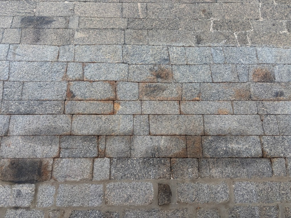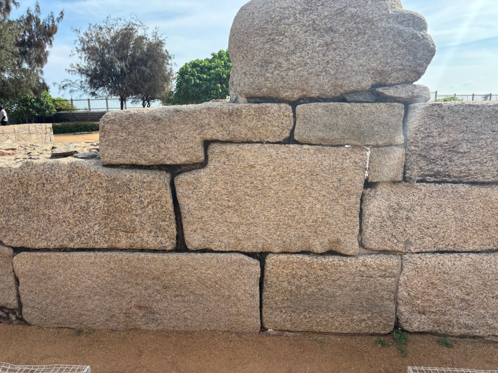 These large blocks were carefully shaped and placed. Their soft appearance is from salt-attack, whereby the salt crystals from the nearby Bengal Sea have penetrated the quartz structure of the granite. As the salt crystals grow over time, they exponentially expand, forcing the stone to slowly degrade. Salt crystals are stronger than ice crystals which typically cannot harm granite.