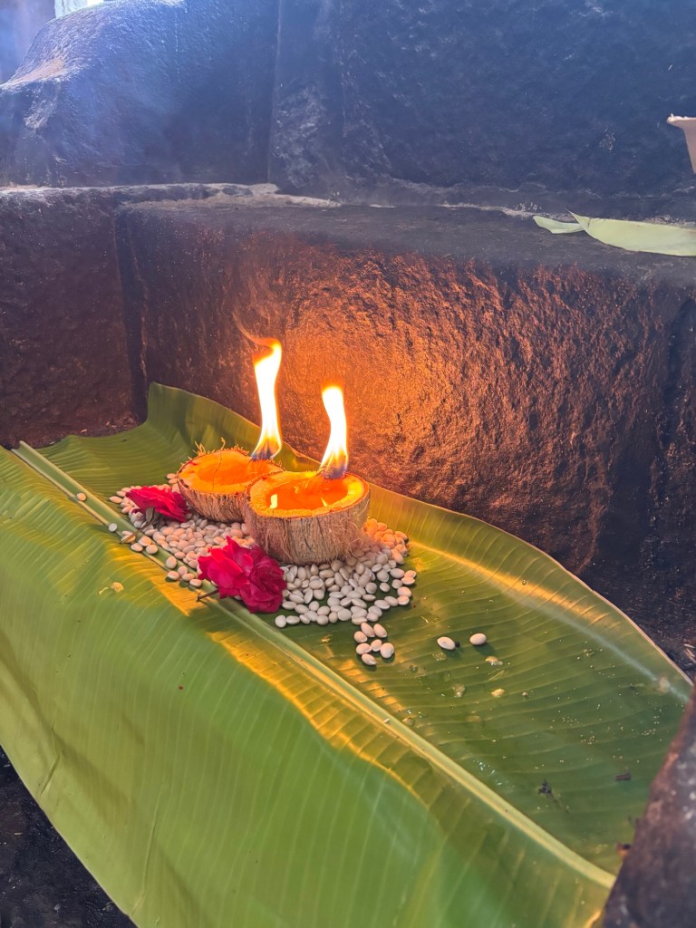 The coconut shell, filled with oil, may have been one of the earliest offering vessels.