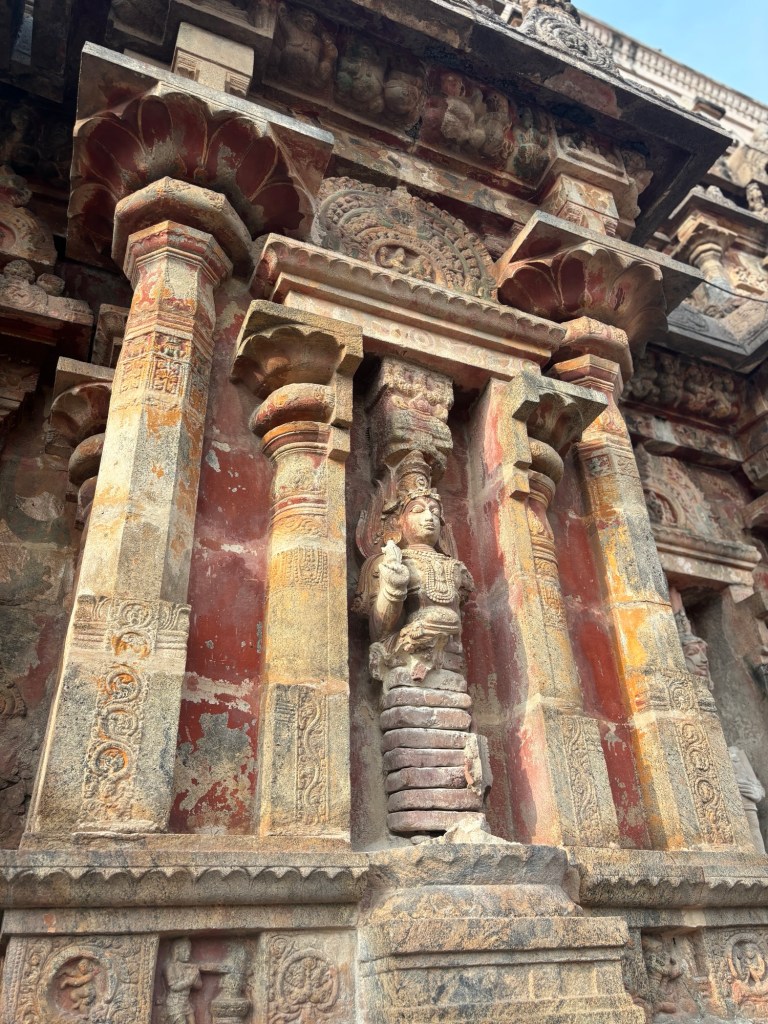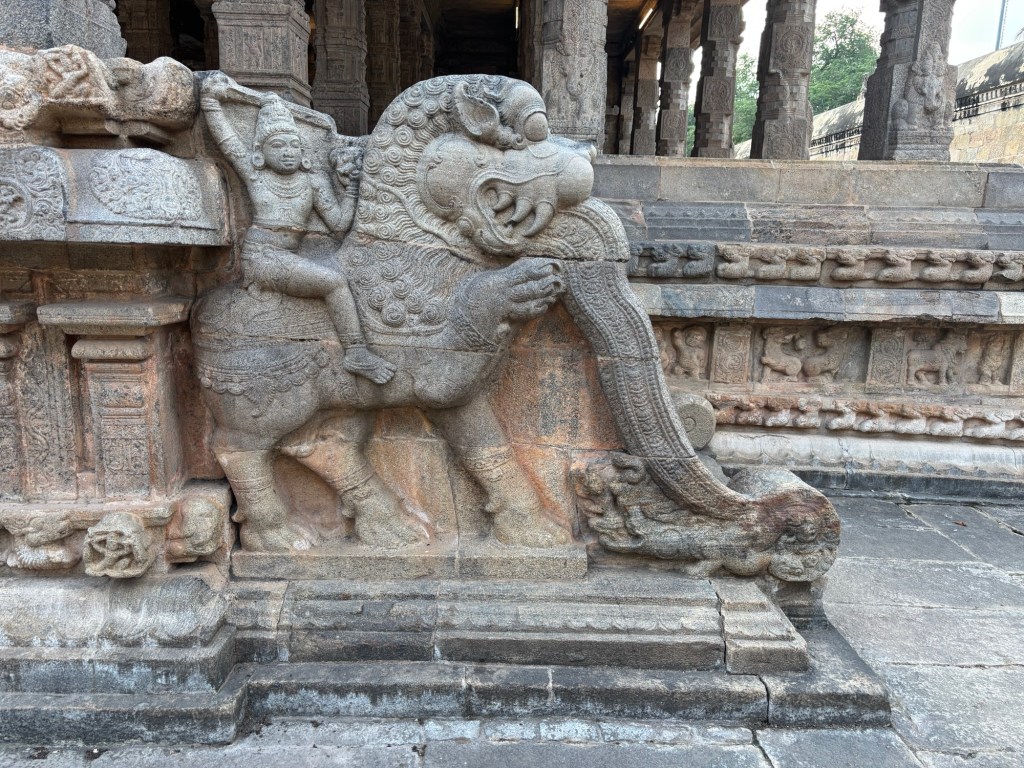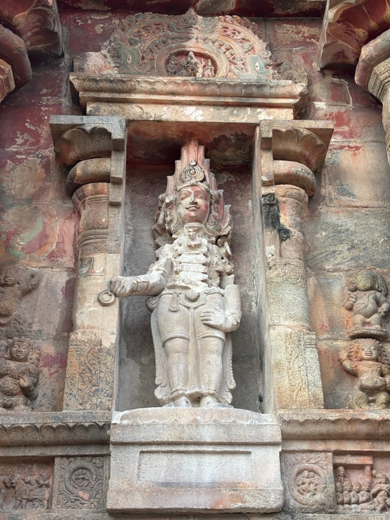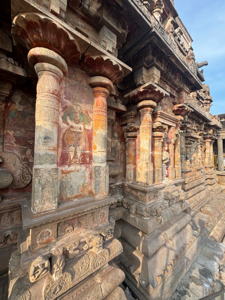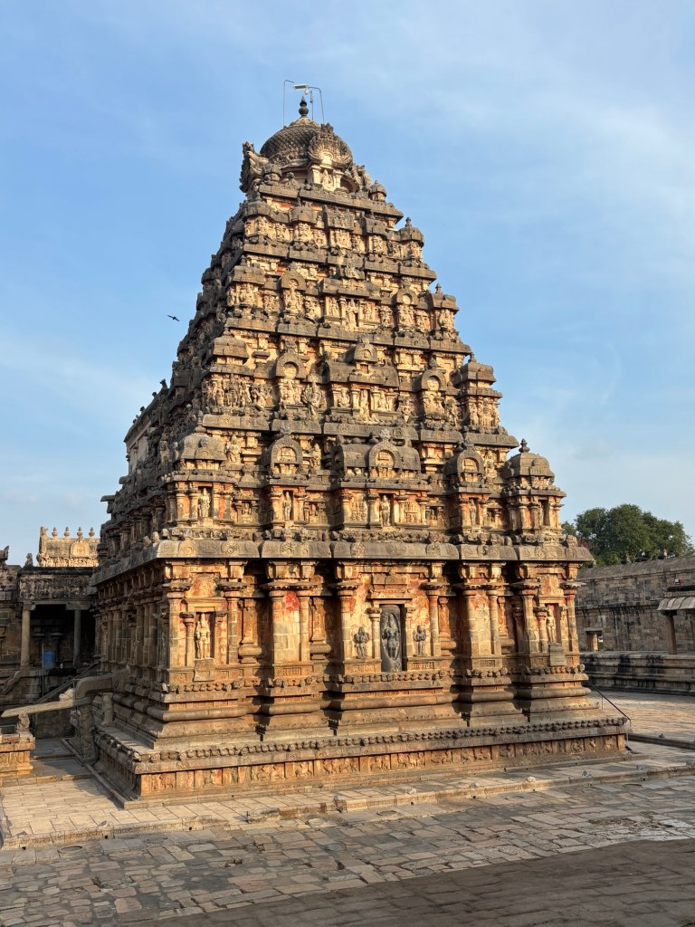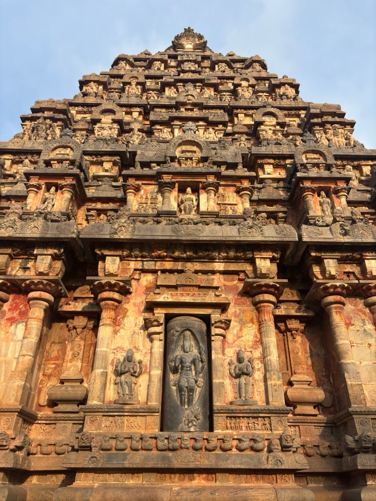 Perhaps the most pure expression of the 12th century Hindu Temple in Southern India can be found at the Airavateswara temple, a UNESCO site at Dharasuram. Here, the gopuram (temple tower) is unpainted, allowing careful study of the many subtle decisions confronting the builders. It may also offer the best preserved sculptures created in plaster, brick, and lime. Masterpieces in their own right, through careful placement under stone protections with well defined drip-kurfs, they have survived more than eight hundred monsoon rain seasons.