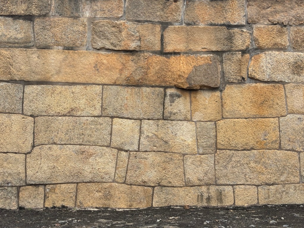 These massive walls were some of the most impressive stonework in the State. The wall assemblies closely follow the Rules of Bondwork, as illuminated in my book (Stone: Ancient Craft to Modern Mastery, Princeton Architectural Press, 2025). The work is uniformly wrought ashlar (with joints less than 1/8” between stones) to maximize frictive contact and wring ultimate strength from the assembly.   Unfortunately, the one rule of bondwork they did not seem to possess or intuit was the “one third rule” which insists the vertical  joint below must land into the middle third of the block above. The consequence of this omission shows up regularly as “stacked joints.” This oversight introduced weakness into the walls causing many to be more easily breached than they would otherwise. One can discern extensive rebuilding as a result.