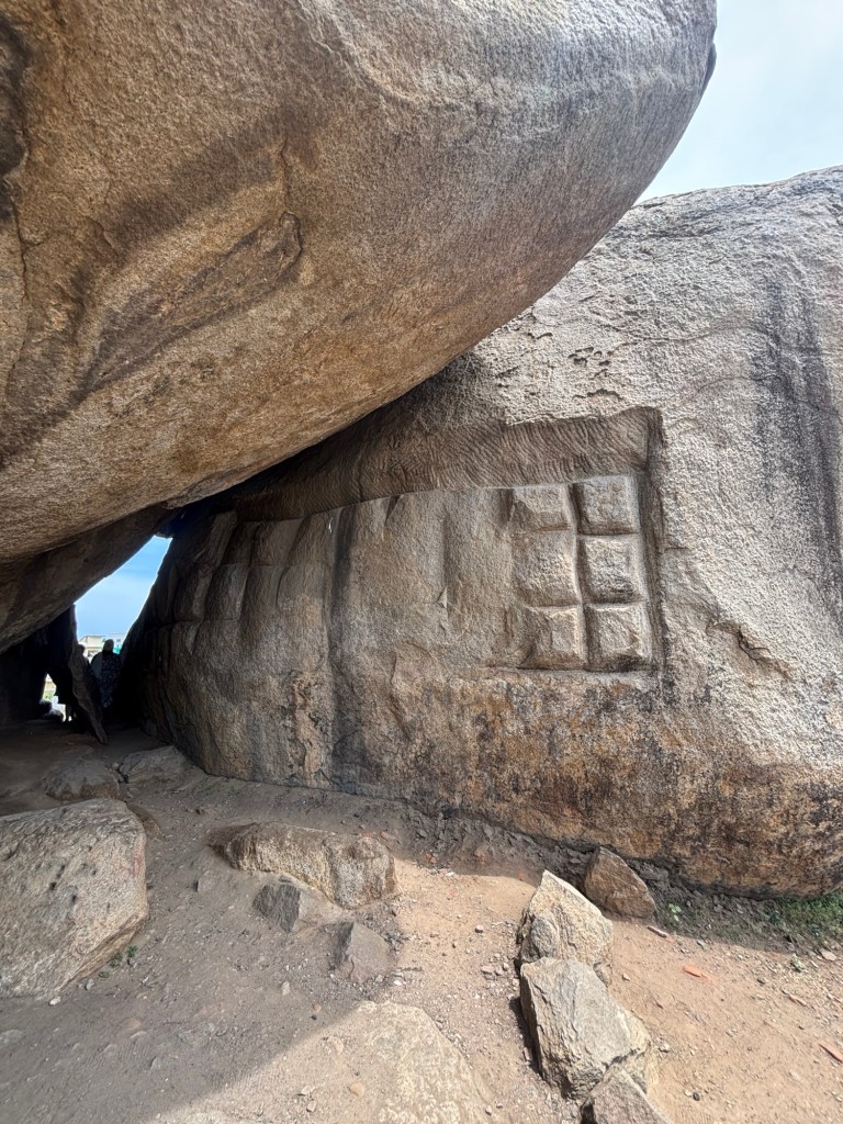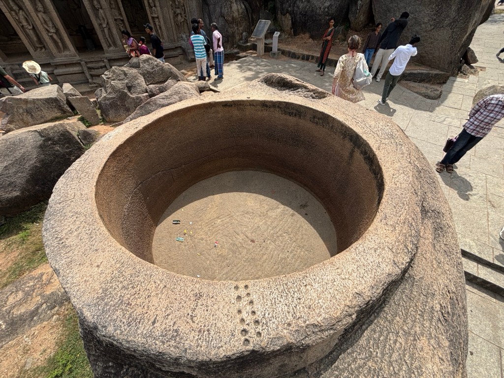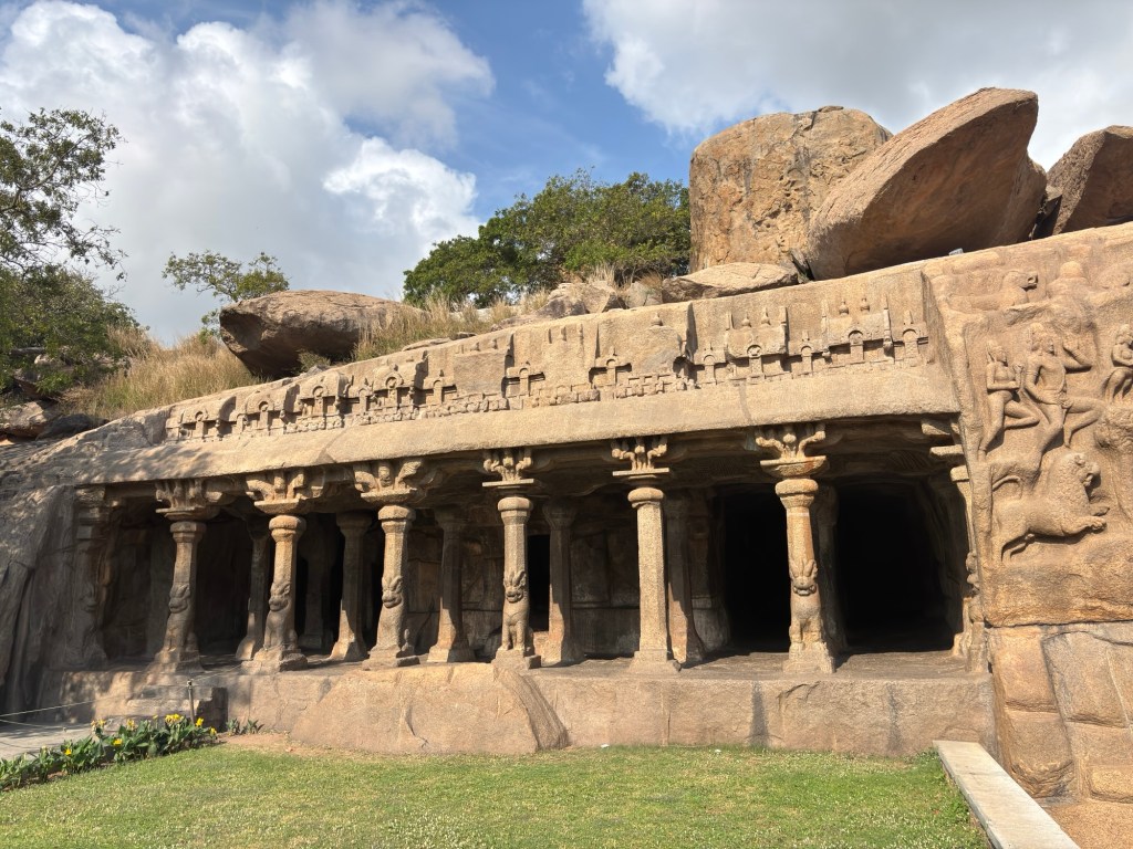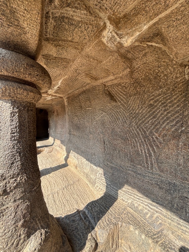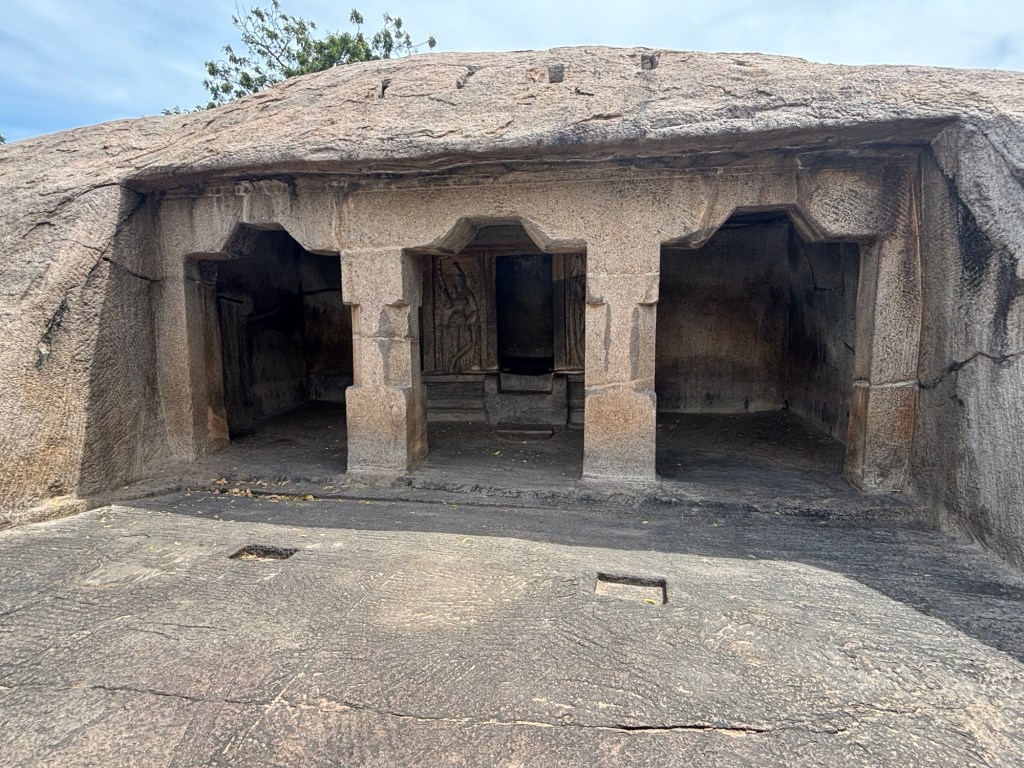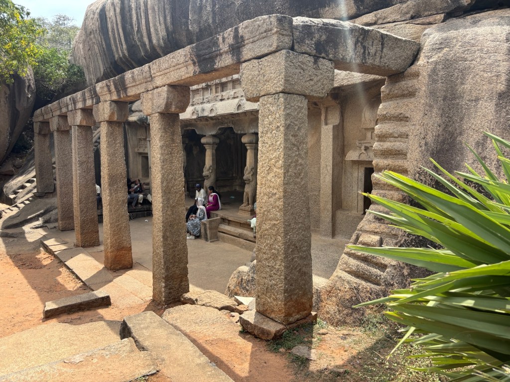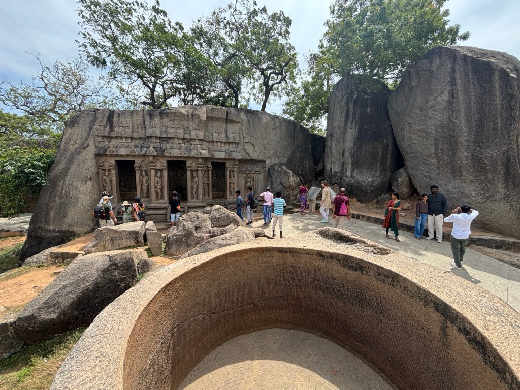 Sacred man-made caves are a feature of both Brahmanic and Buddhist traditions. And there are two distinct types: hollowed out artificial caves or those carved from the top downwards, creating architectural forms of  a sculptural character.   Mahabalipuram has both.