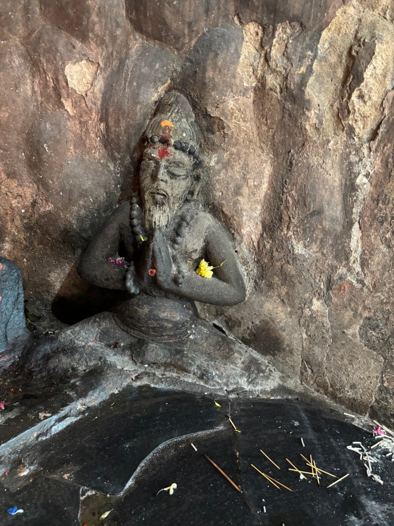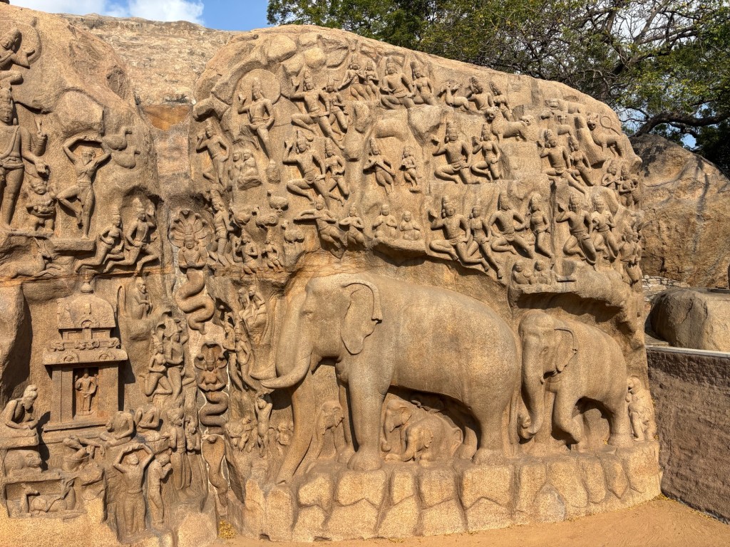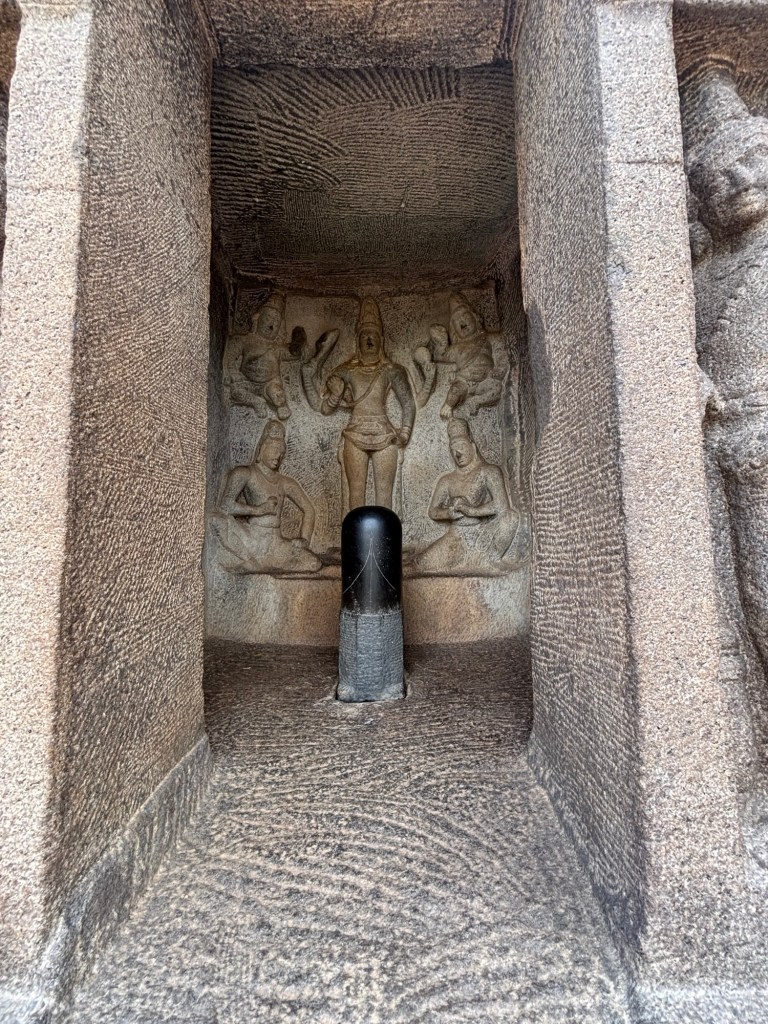 This photo only shows half of the massive, high-relief sculpture currently called “Arjuna’s Penance,” although when I studied it was known as the “Descent of the Ganges.” The diorama is carved directly into two massive boulders more than forty feet tall. Where the boulders join, the reported mythical river Ganges is invoked. It’s a powerful work of art hailing from about 650 CE.