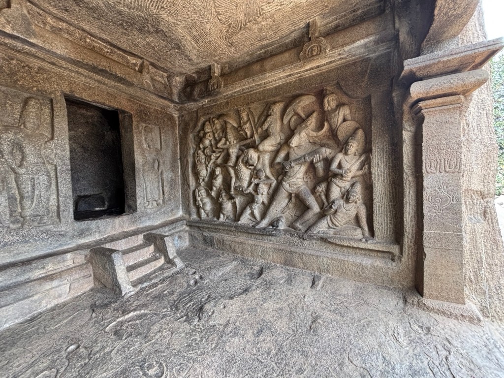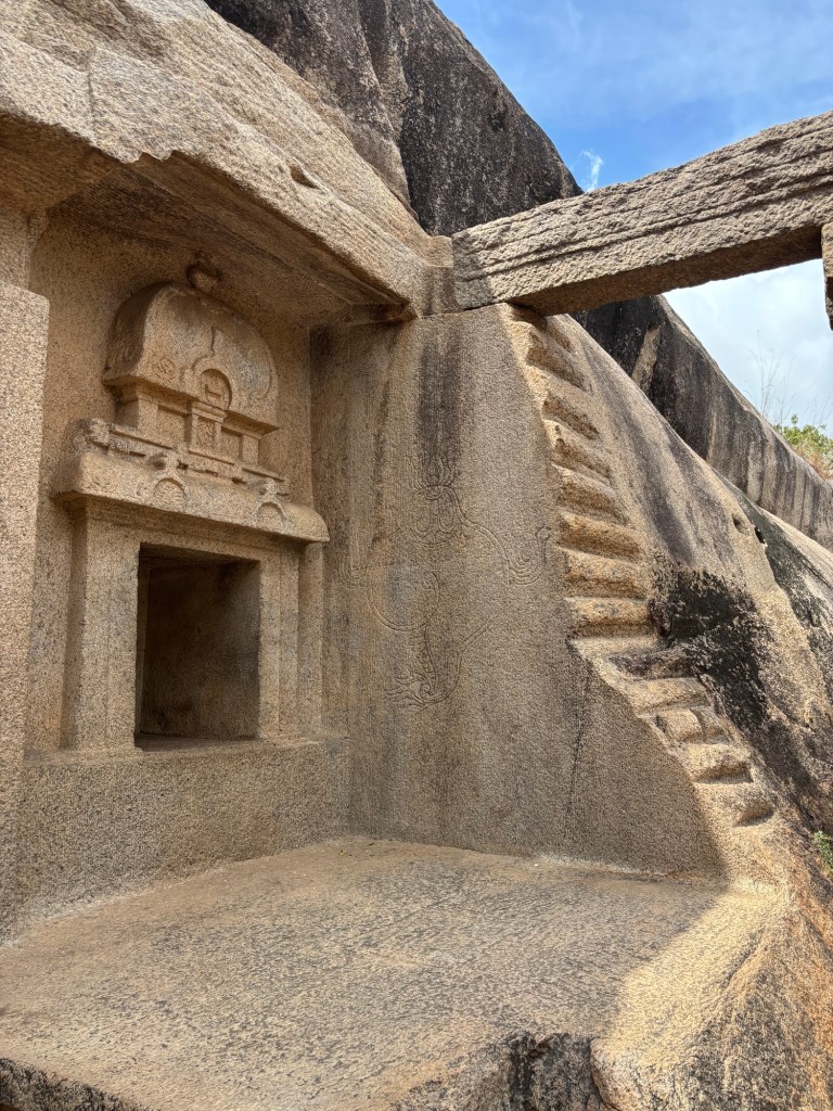 Built almost 1000 years after the first rock cut temples at Ajanta in 2nd century BCE, the Tamil rock-cut temple examples at Mahabalipuram are significantly smaller. Completed in the 7th century CE,  they contain rock-cut caves with sculpted panels of deities. Like small jewel boxes, they are equally remarkable.