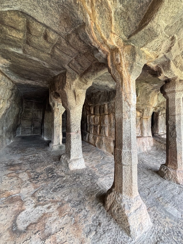 In the larger carved caves, columns are left to support the ceiling above. Note the sculptural panels at the rear of this “room” remain unfinished.