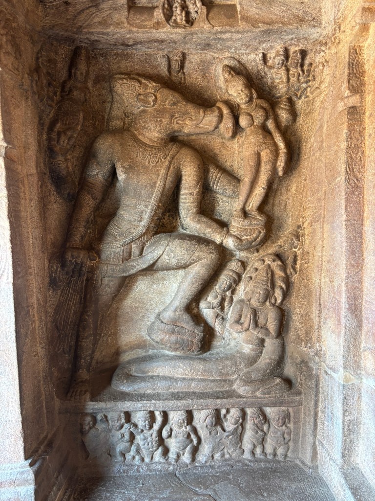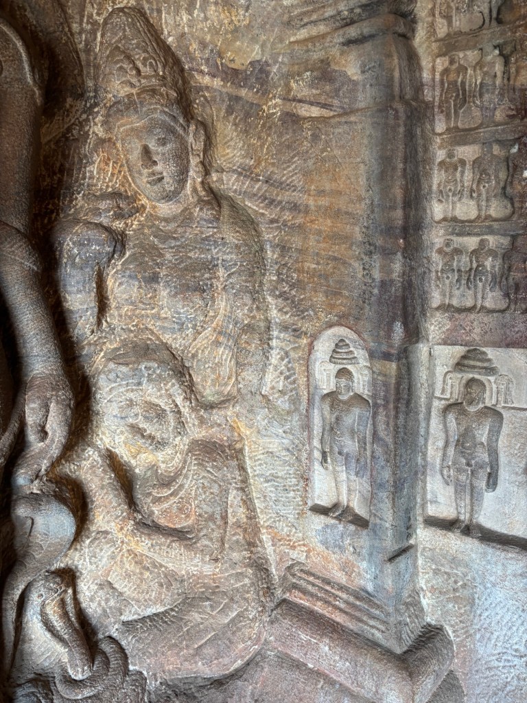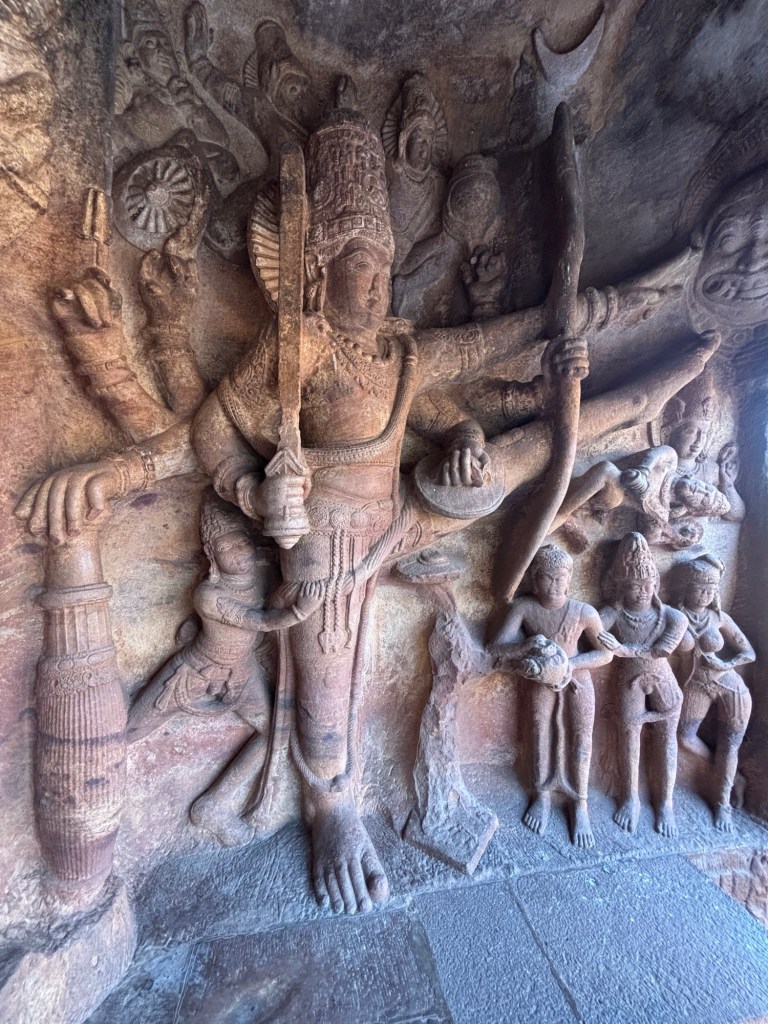 Rock cut caves dating from 550 CE at Badami in Northern Karnataka Even the columns, remaining connected to the living rock both top and bottom are exquisitely carved. The subtle mineral staining and grain of the quartzitic sandstone is further highlighted by the delicately carved column. The light in the cave is managed so that the lingam (Lord Shiva in lingam form) in the far depths of the cave remains illuminated.The stone carvers at Bedami were indeed true virtuosi. In fact, all three of of the primary rock cut caves have been signed by the master carvers who led the effort. From a Western perspective, this is very unusual and demonstrates a cultural appreciation for the artists involved. It may be of interest to learn that sculptors and stone carves in Europe did not sign their work until the 12th century. This larger than human scale, high-relief sculpture features Vishnu in his incarnation as the man-boar Varaha when he “rescued the earth.” This sculpture remains unfinished. You can clearly see how the carver was roughing out the form, and slowly adding depth. The lines are made by the tip of the carving point, a chisel that looks much like a very fat pencil with a dull tip. The softened light from the cave entrance highlights the subtlety of the high-relief stone sculptures.Playful forms carved at the entrance of the Cave/ temple. These sit below the floor elevation and appear to be helping to support the floor plane of the rock cut temple. Note the careful undercutting at the entrance roof to force the rain water to drip directly downward and not wick inward onto the cave’s interior ceiling. Visiting high school students, excited to practice their English skills and make sure I was rooting for India in the Cricket World Cup.