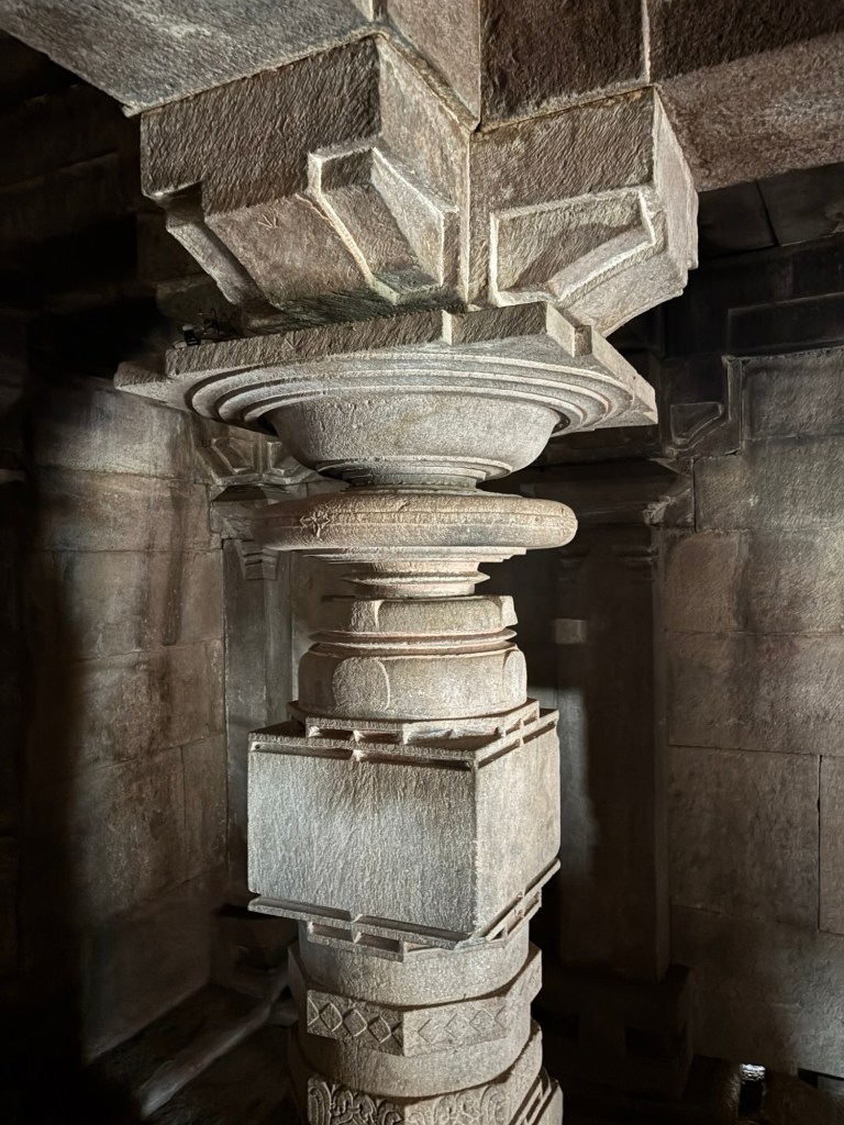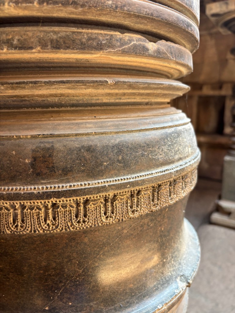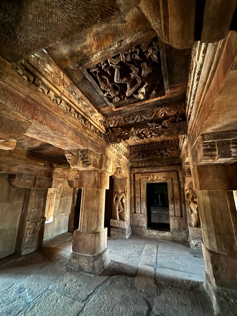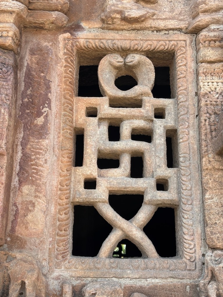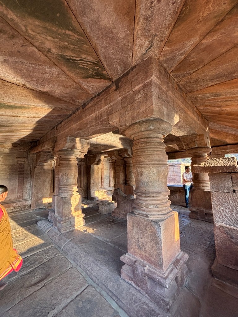 This column was turned on the lathe, and then carved in minute detail. The craftsmanship is exemplary. This form is much more pleasing, a blend of lathe turned and carved elements. Note how the spanning quartzitic sandstone “planks” have been carefully tapered to bridge from the exterior to interior columns. In the high heat (97F, 36C), I wasn’t able to sketch as much as I would have liked. But I find it enormously satisfying when I can manage it. At the nearby UNESCO site known as Pattadakal, the temple has been partially dismantled, offering a rare glimpse into the construction method. This “jalis”, or stone window screen, incorporates the rising Kundalini snakes that are the precursor to the caduceus, the traditional emblem of Hermes. Even in the UNESCO site Pattadakal, there are active temples where worship takes place. The emotional charge such spaces continue to carry is palpable. Indeed, in these charged spaces, the archetype of the divine is highly charged and the veil is very thin.