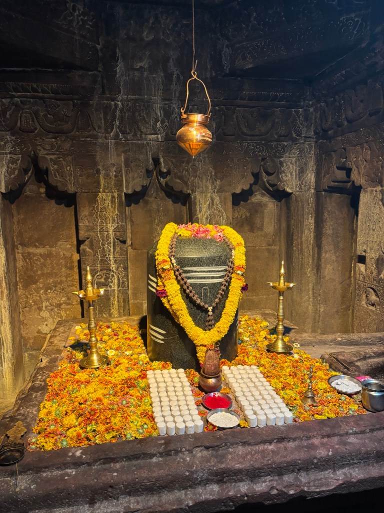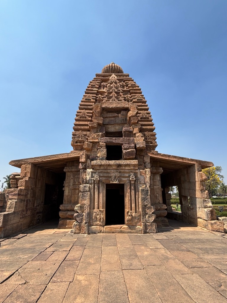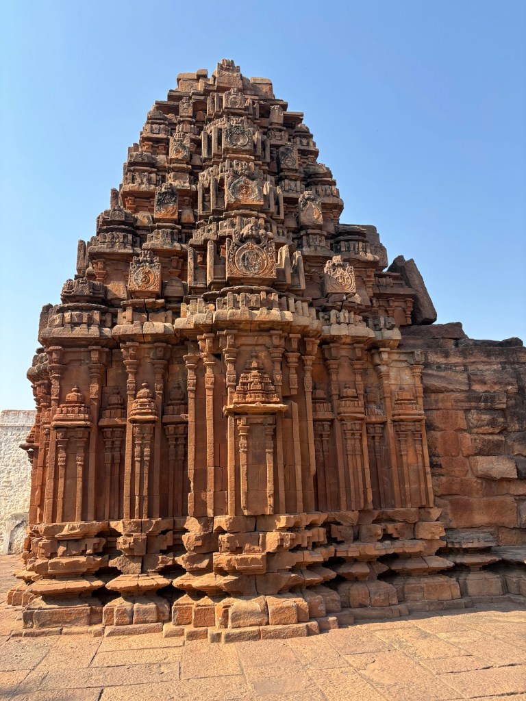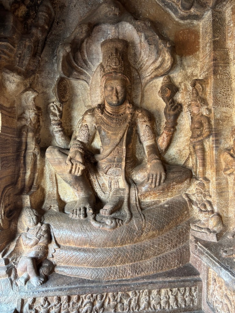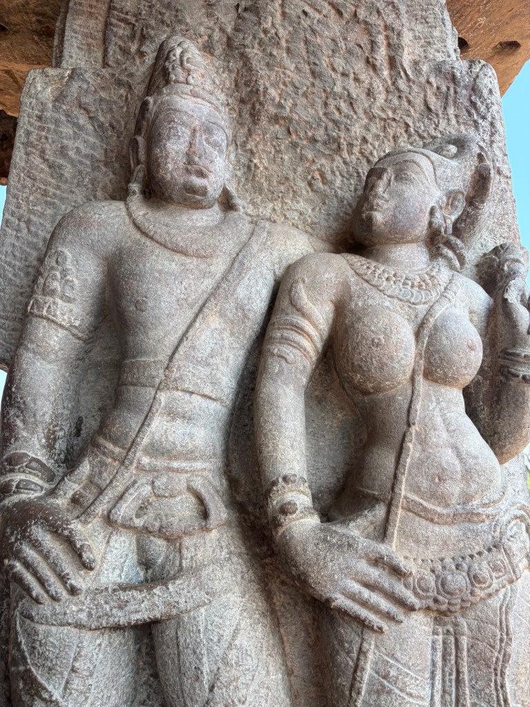 This column was turned on the lathe, and then carved in minute detail. The craftsmanship is exemplary. This form is much more pleasing, a blend of lathe turned and carved elements. Note how the spanning quartzitic sandstone “planks” have been carefully tapered to bridge from the exterior to interior columns. In the high heat (97F, 36C), I wasn’t able to sketch as much as I would have liked. But I find it enormously satisfying when I can manage it. At the nearby UNESCO site known as Pattadakal, the temple has been partially dismantled, offering a rare glimpse into the construction method. This “jalis”, or stone window screen, incorporates the rising Kundalini snakes that are the precursor to the caduceus, the traditional emblem of Hermes. Even in the UNESCO site Pattadakal, there are active temples where worship takes place. The emotional charge such spaces continue to carry is palpable. Indeed, in these charged spaces, the archetype of the divine is highly charged and the veil is very thin.