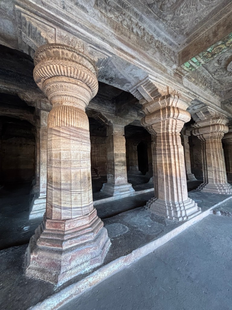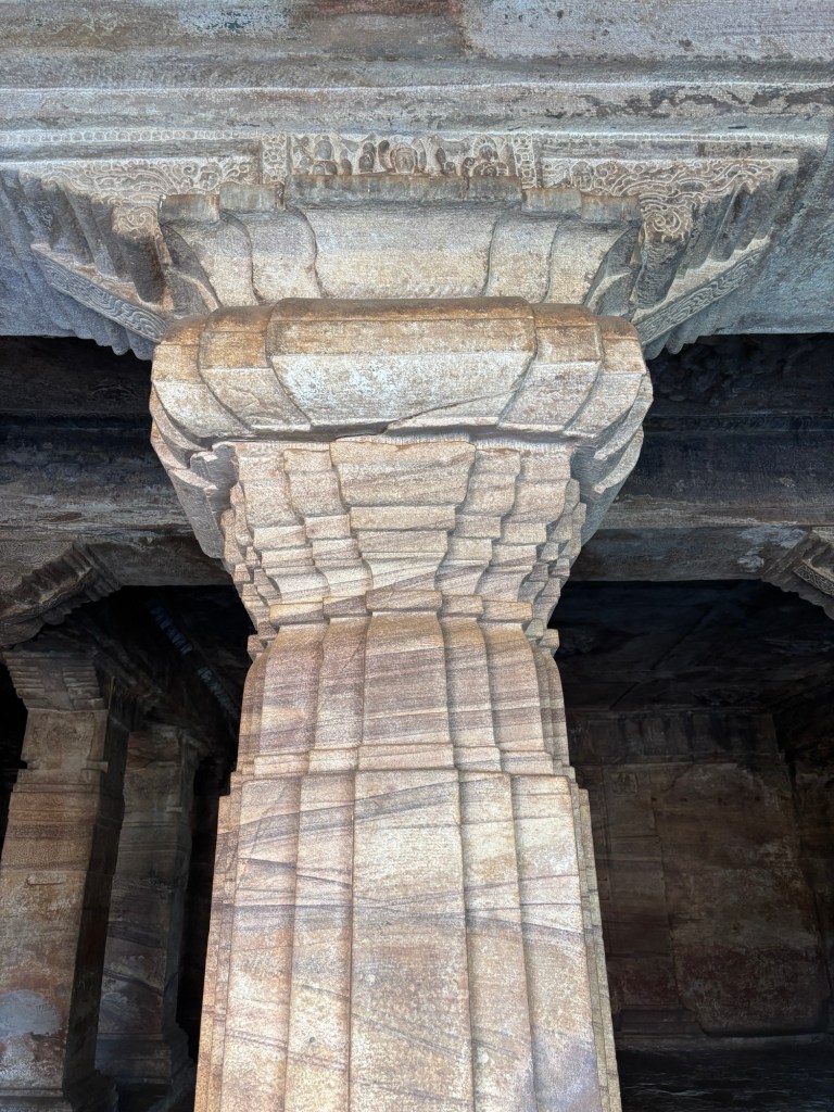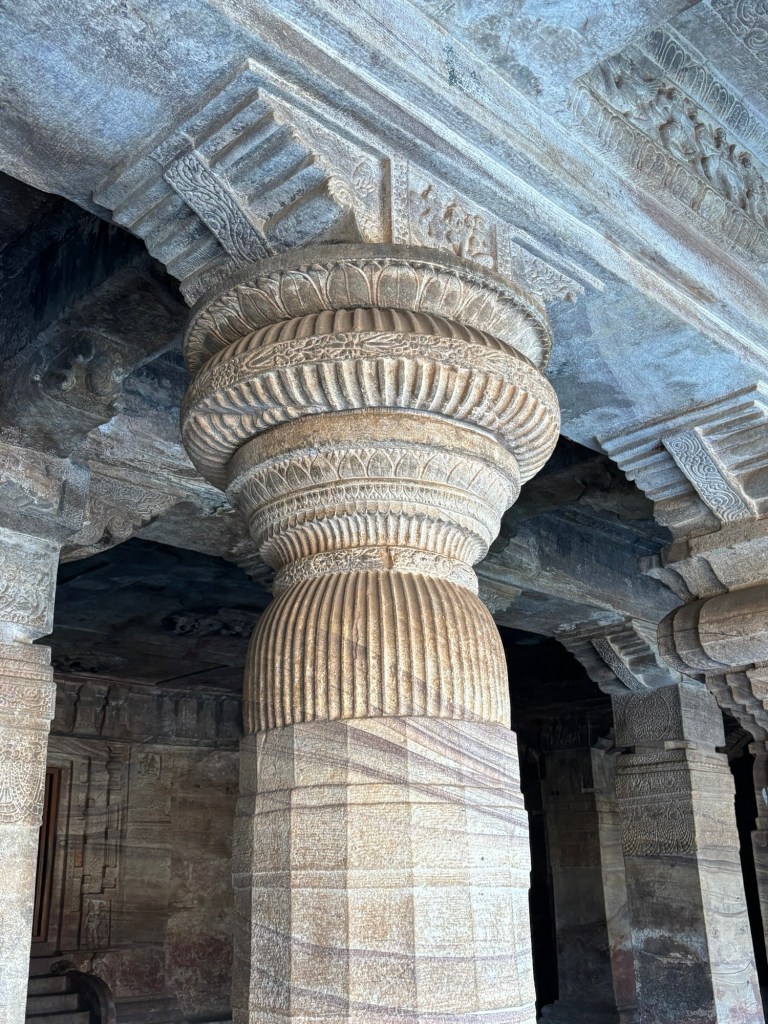 These lathe turned columns occur at Aihole (a day’s ride from Bedami) and reportedly date from the 8th century CE. Not all the lathe turned columns are visually successful.